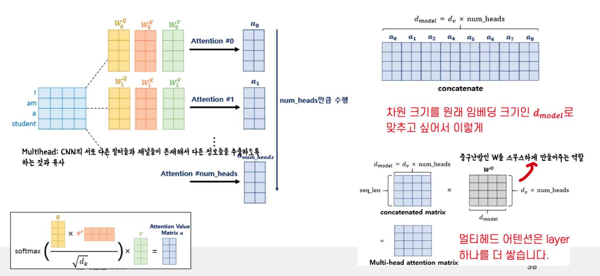 Multi head 는 CNN의 서로 다른 필터들과 채널들이 존재해서 다른 정보들을 추출하도록 하는 것과 유사하다.