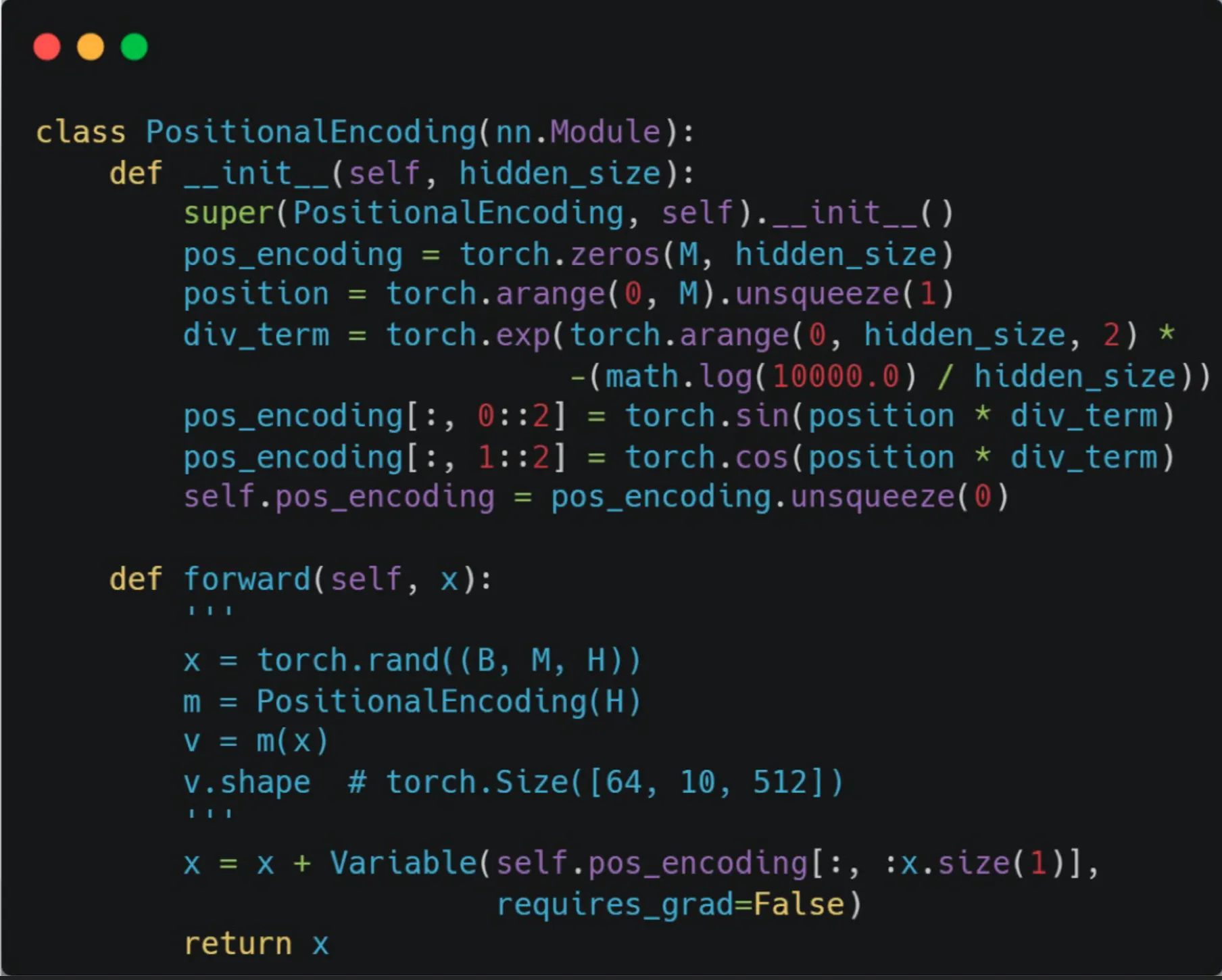 이 때문에 Postional encoding vector 를 추가로 구해서 임베딩 벡터에 더해준다.
