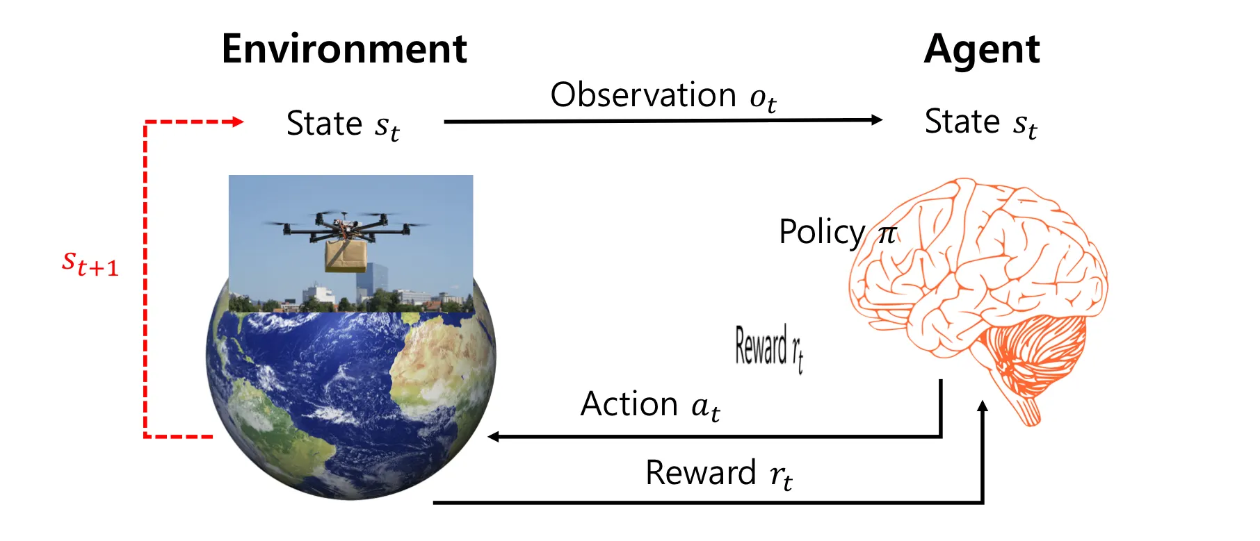 강화학습의 구성성분은 크게 두개로 나눌 수 있는데, (1)행동의 주체인 에이전트(Agent)와 (2)보상을 주고 상태변이를 일으키는 주체인 환경(Environment)이다. 에이전트를 제외한 모든 것을 환경이라고 봐도 된다.
