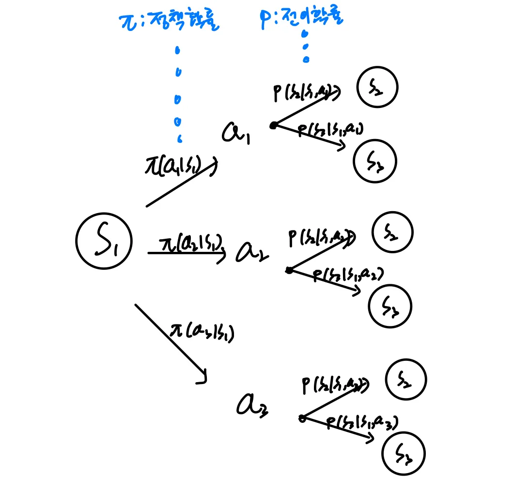 에서 로 전이할 때 정책확률와 전이확률 라는 두개의 확률이 적용됨을 짚고 넘어가자. 다음주 벨만 방정식을 공부할 때 더 잘 이해할 수 있을 것이다.