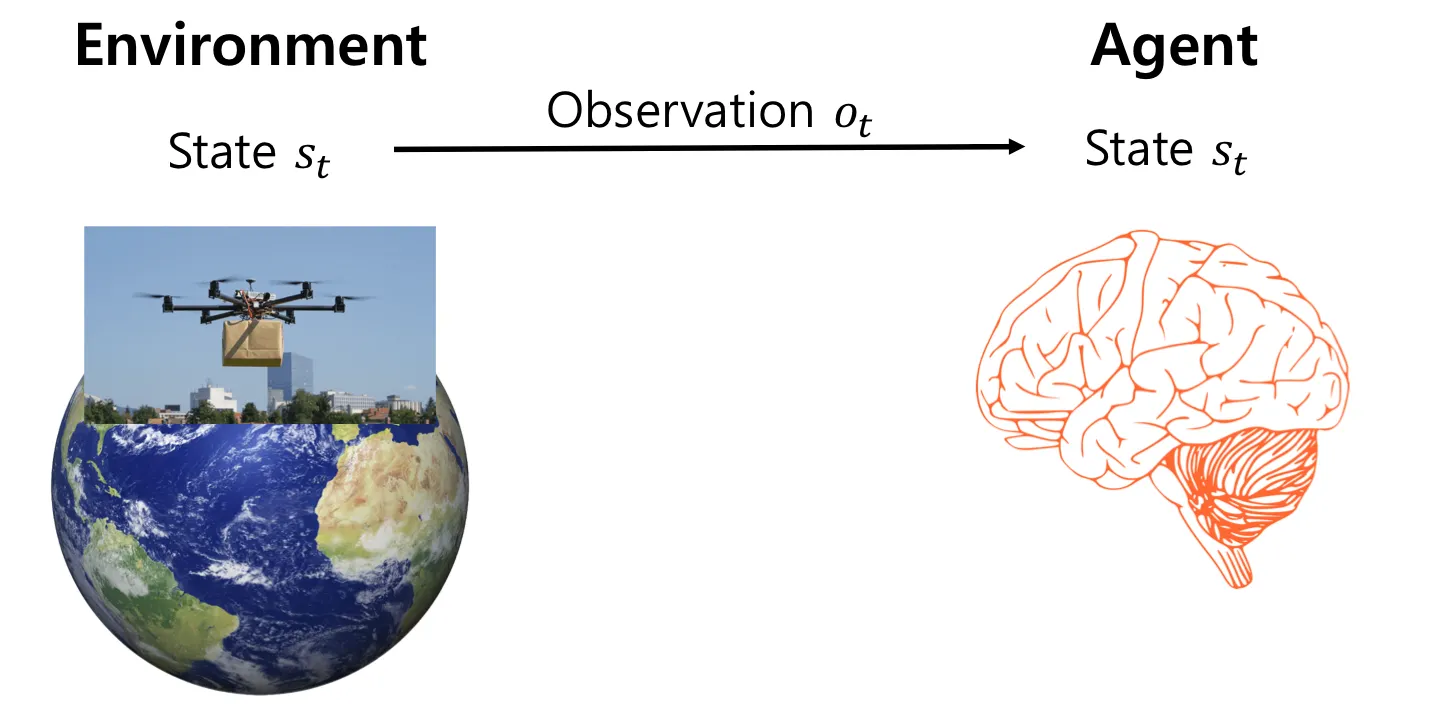 특정 시점에서 에이전트가 환경을 관측했을 때 얻게되는 정보를 의미하며, 이 상태 정보를 통해 에이전트는 어떤 행동을 할지 결정하게 된다.