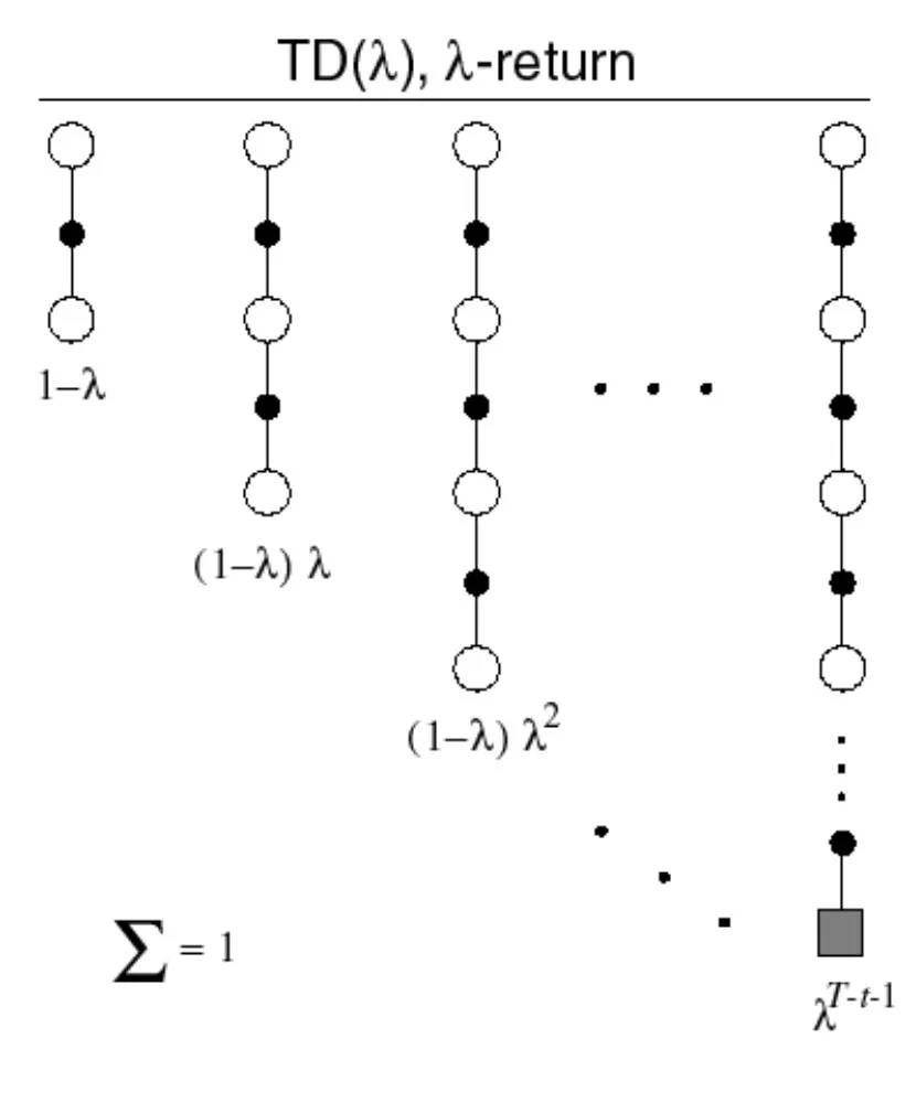 TD lamda : TD(0) ๋ถํฐ MC๊น์ง ๋ชจ๋ ๊ฒ์ ํ๊ท ๋ด๋ ๊ฐ๋ฅํ๋ค.