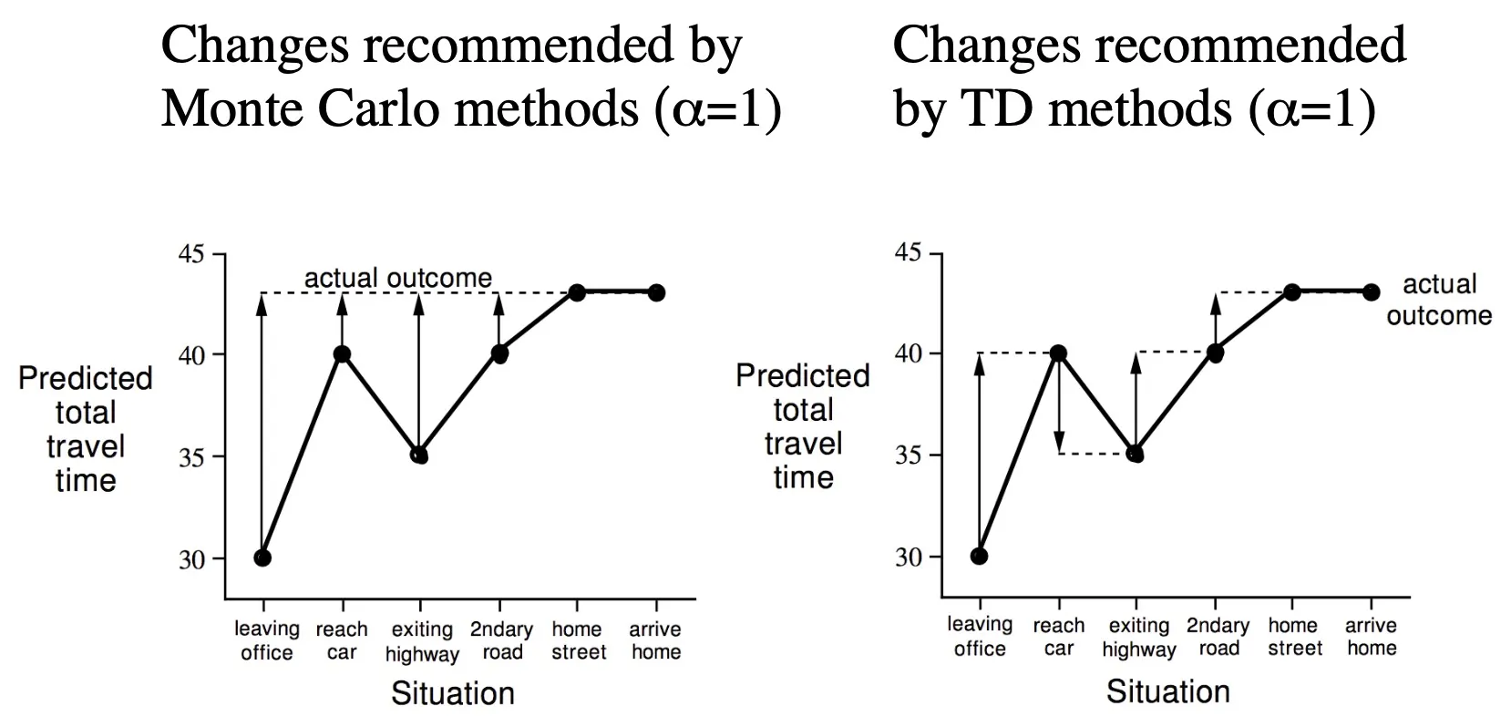 MC๋ ๋๊น์ง ๊ฐ๊ธฐ ๋๋ฌธ์ ์ํจ, DP์ TD๋ ํ step๋ง ๊ฐ์ ํ๊ธฐ ๋๋ฌธ์ ์ ์ฉ