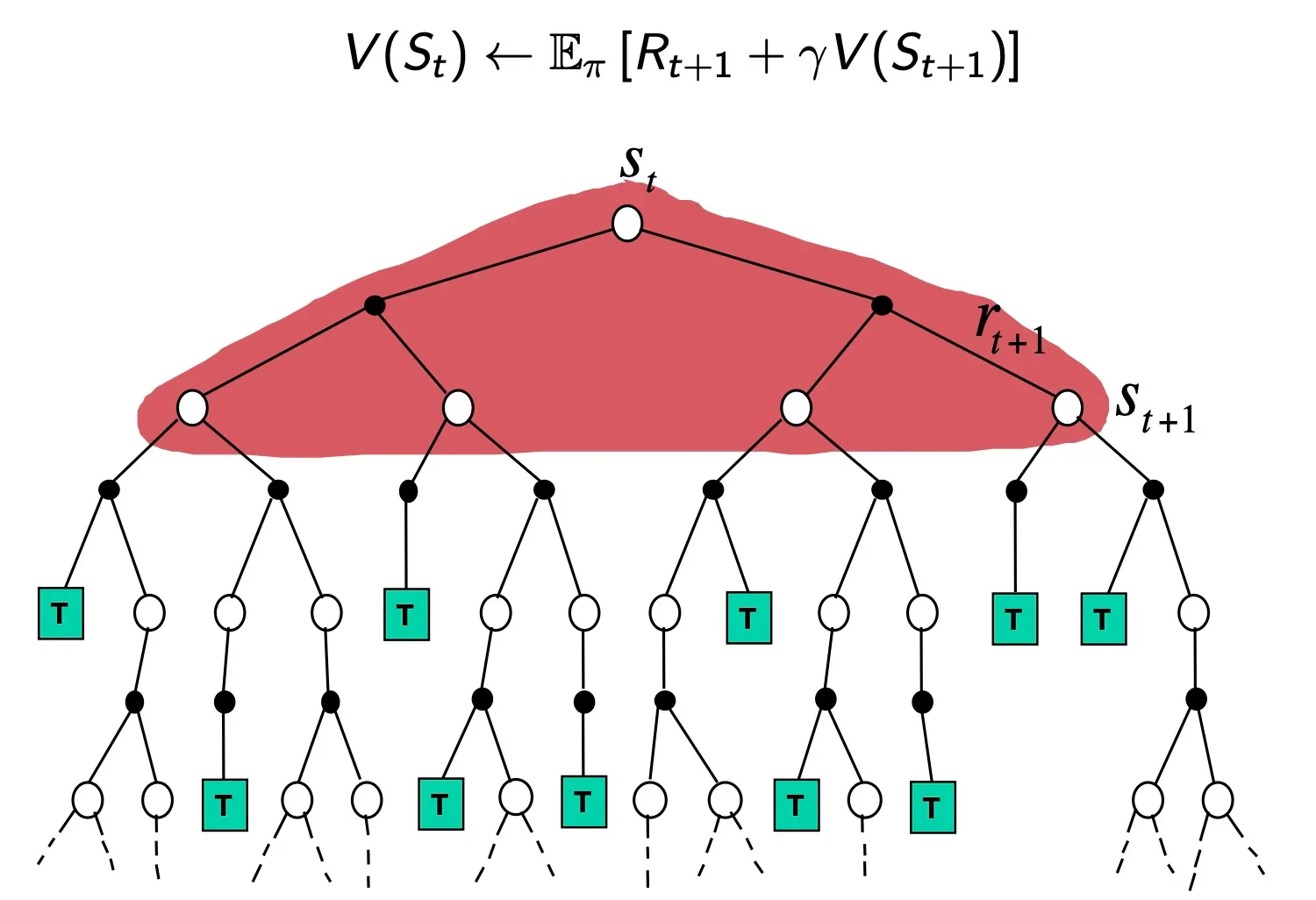 DP๋ Sampling ๋๊น์ง ํด๋ณด์ง ์๊ณ , ๊ทธ ์นธ์์ ํ ์ ์๋ ๋ชจ๋ actions์ ๋ํด์ ํ step ๊ฐ๋ณด๊ณ , ๊ทธ ์นธ์ ์ ํ ์๋ value๋ก full-width update