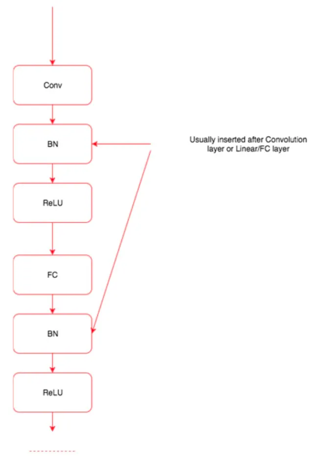 배치 정규화 레이어는 컨볼루션 레이어 또는 선형/전연결 (FC) 레이어 다음에 위치한다.