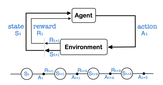 ํ์ต๊ณผ์ ์์ agent๋ ๊ฐ state์์ policy๋ฅผ ๊ธฐ๋ฐ์ผ๋ก action์ ์ ํํ๋ฉฐ ๊ทธ ๊ฒฐ๊ณผ reward๋ฅผ ์ป์