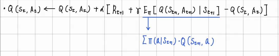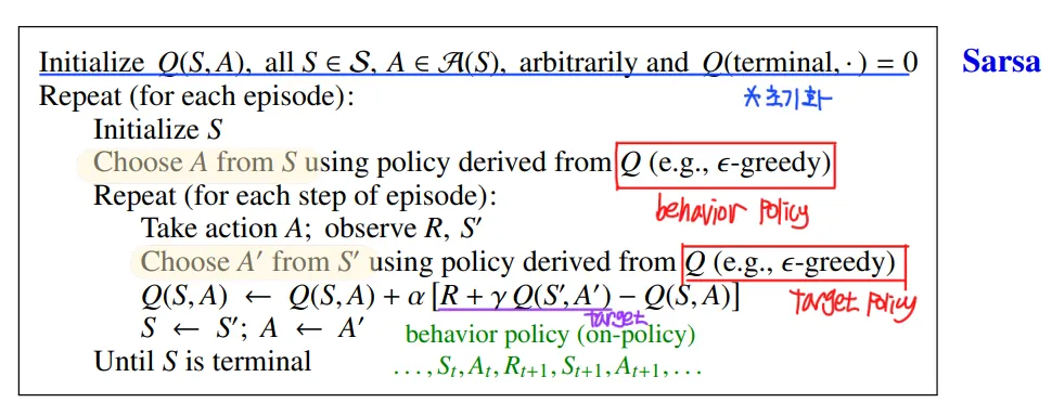 SARSA에서 target Q를 계산하는데 있어 이전 policy에서 얻은 은 현재 policy에서 유효한 값이 아니므로 사용 불가 (On-policy)
