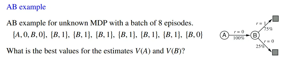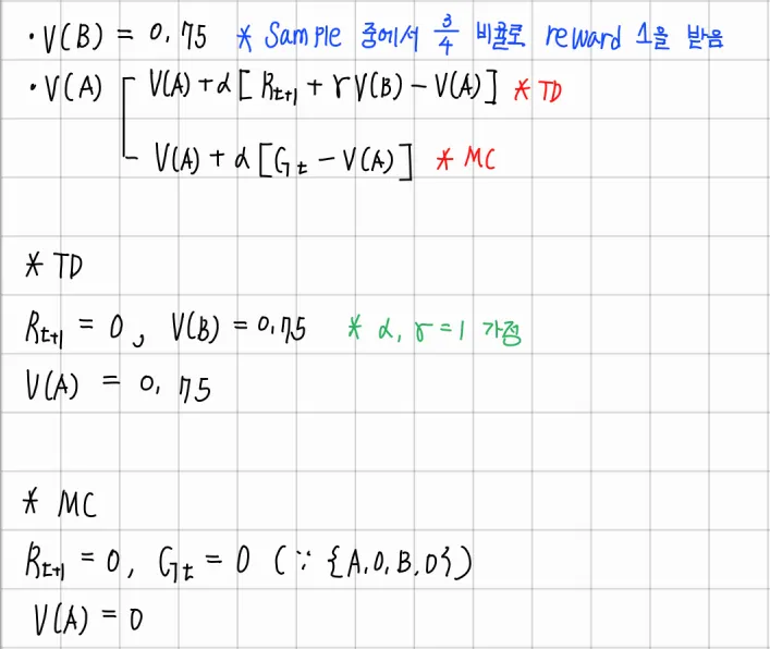 결과적으로 TD가 아직 생성되지 않은 future data까지 고려한다면 더 나은 성능을 보인다고 볼 수 있다. 왜냐하면 새로운 data를 더 생성한다면 75%의 비율만큼 reward를 1을 받는 data가 생성될 것이기 때문이다. 반면 MC는 기존에 존재하는 data에 충실한 답을 제공한다.