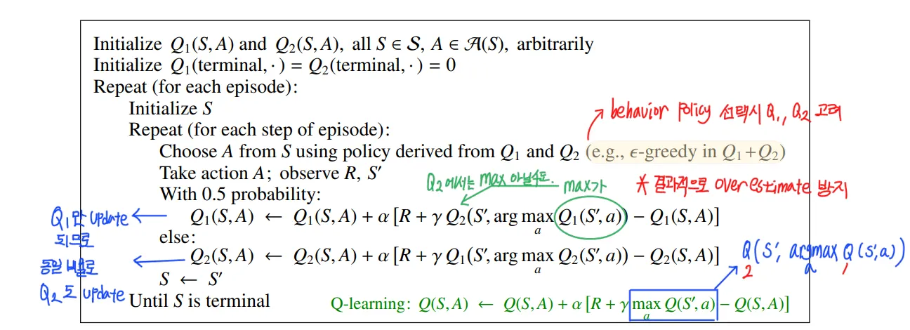 하나의 Q-table은 Target을 위한 Q-table이고 다른 하나는 maximization operation을 위한 Q-table이 됨.
