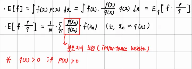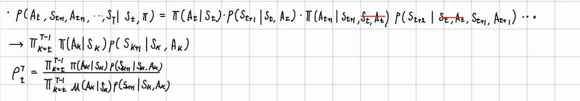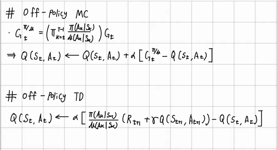 MC: behavior policy 에 의하여 experience를 쌓고 그것을 바탕으로 를 계산하기 때문에 에 weights를 곱해주어야 함