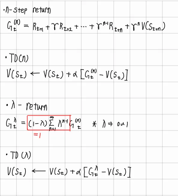 n-step return 여러개를 가중 평균 방식으로 합하여 Target으로 적용한 것이 TD() 방식