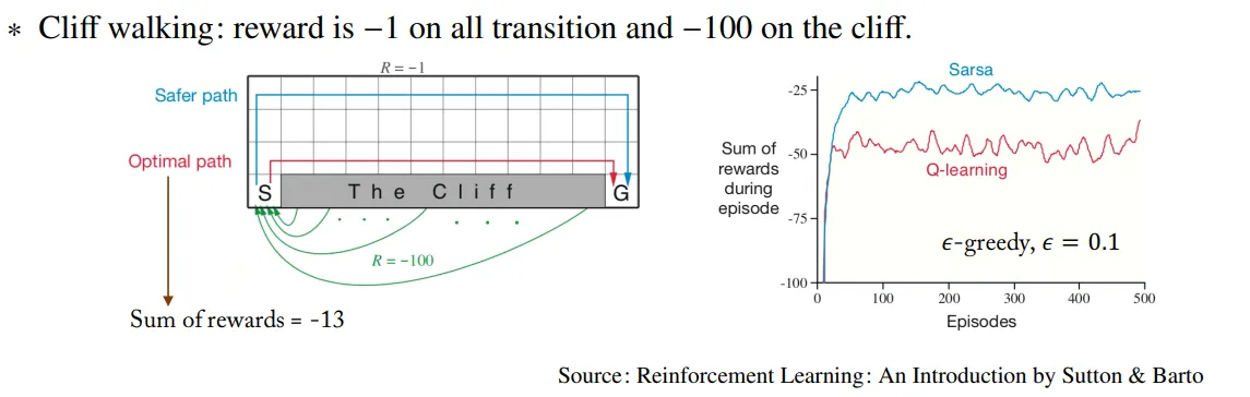 이 경우 Q-learning이 SARSA에 비해 성능이 낮게 나온다. 왜냐하면 SARSA의 경우 Target Policy와 behavior policy가 모두 Q에 대해 policy이기 때문에, Cliff 근처에서 만큼의 확률로 cliff로 빠지게 될 가능성을 고려하므로 항상 Q value를 Maximization 하는 방향으로 학습하는 Q-learning에 비해 안전한 경로를 선택하게 되고, 따라서 성능이 SARSA가 Q-learning이 만큼 cliff에 빠지는 수치만큼 우수해진다.